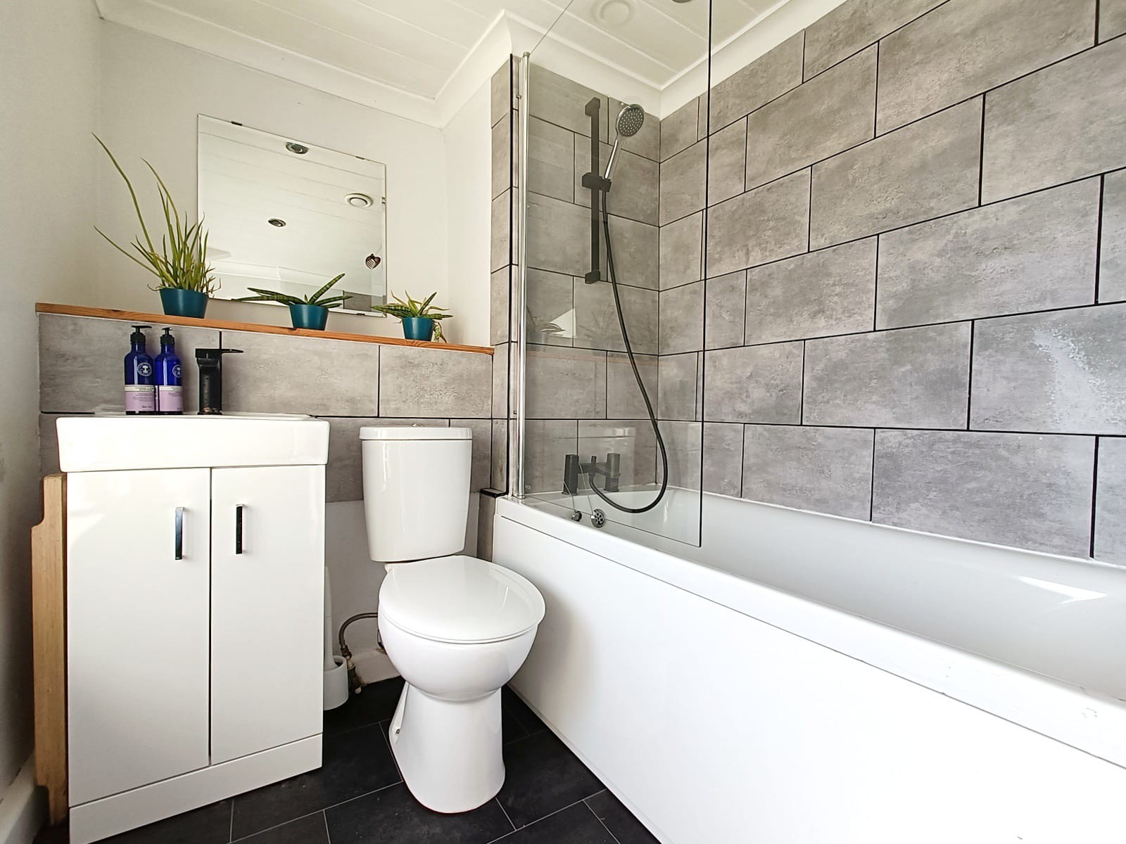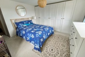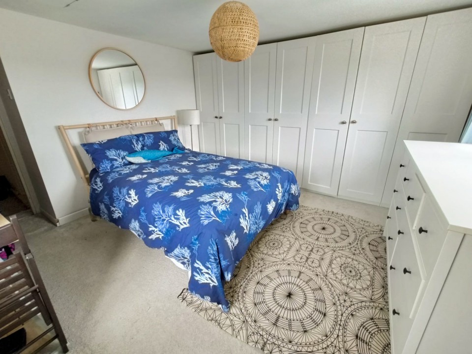 7' 6" x 9' 10" (2.3m x 3.0m max) uPVC double glazed window to front elevation. Period cast iron fireplace painted white. Fitted wardrobe with mirrored door containing shelving, drawers and hanging space inside. Traditional painted planked ceiling. Fitted carpet. TV point. Radiator.