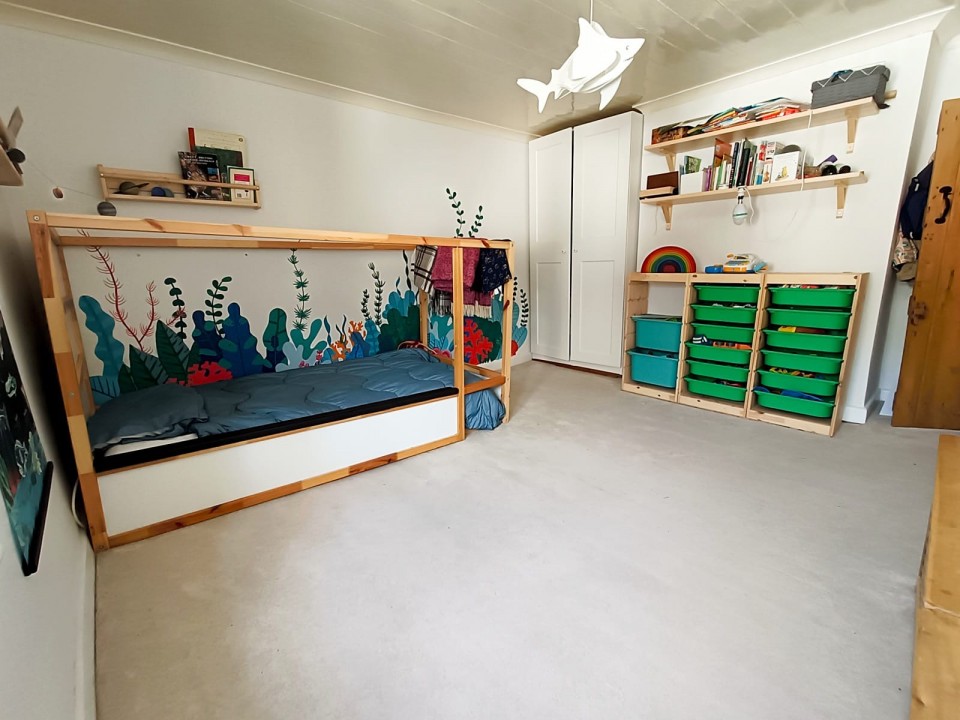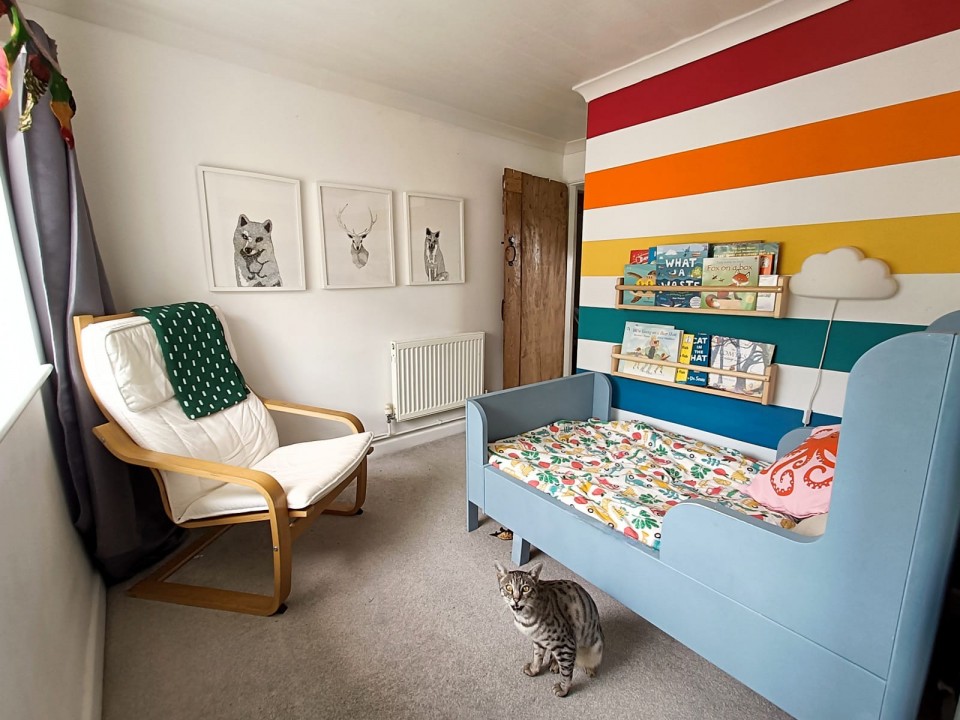 13' 6" x 14' 1" (4.14m x 4.3m) uPVC double glazed window to front elevation with window seat below. Deep cupboard over stairs with slatted shelving and fuse box. Loft access with retractable ladder providing access into the loft, which is boarded and has light. Traditional wood planked ceiling. Fitted carpet. Radiator. TV point. Ceiling light.