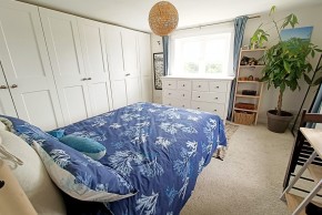 7' 6" x 9' 10" (2.3m x 3.0m max) uPVC double glazed window to front elevation. Period cast iron fireplace painted white. Fitted wardrobe with mirrored door containing shelving, drawers and hanging space inside. Traditional painted planked ceiling. Fitted carpet. TV point. Radiator.