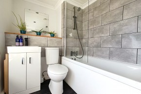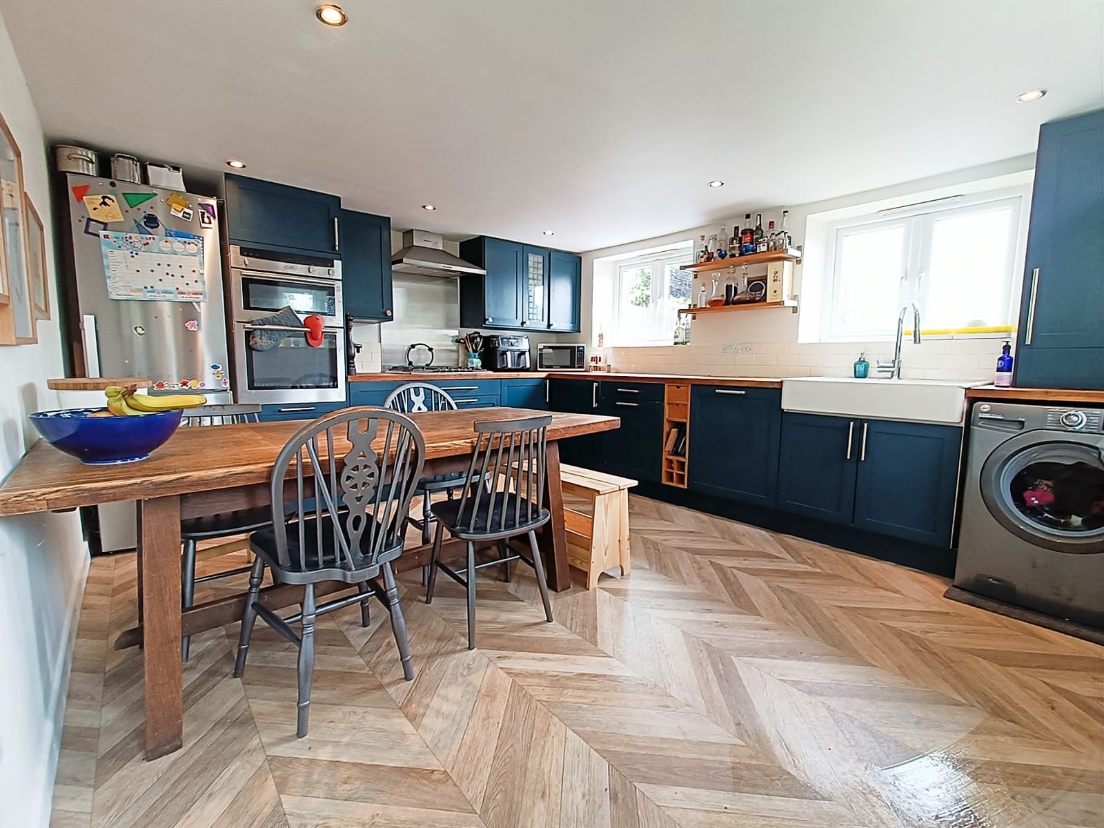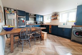 11' 9" x 13' 9" (3.6m x 4.2m) Two uPVC double windows to the rear elevation overlooking the garden and uPVC double glazed window to the side overlooking patio area. UPVC stable door, with the top half glazed, leading out onto the patio and garden. A range of floor and wall mounted units with oak veneer doors and solid oak worktop and tiled splashback. Integrated Neff electric double fan assisted oven and grill, gas 5-ring Neff hob. Hotpoint extractor fan, which extracts to the rear of the property. Integrated Hotpoint dishwasher. Space and plumbing for washing machine. Cupboard housing gas boiler. White ceramic double sink with period-style mixer tap. Parquet wood effect laminate flooring. Recess ceiling spotlights. Double radiator.