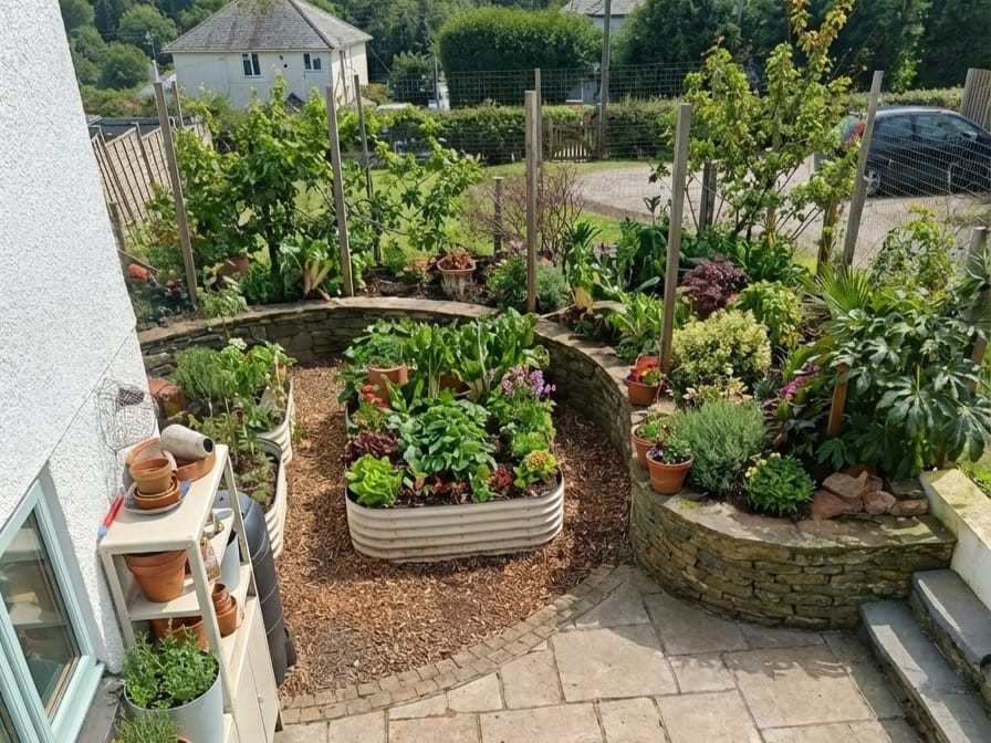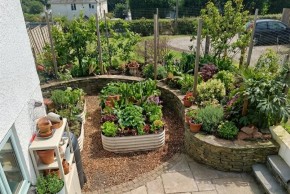 To the rear of the property there is a garden, enjoying a southerly aspect, featuring 2 limestone paved patio areas, power point, raised beds and natural stone wall with raised beds featuring a variety of small shrubs, perennials and fruit trees. Wood and wire fence to the boundary. Outside tap. Doors from the patio area lead into the kitchen, study and garage.