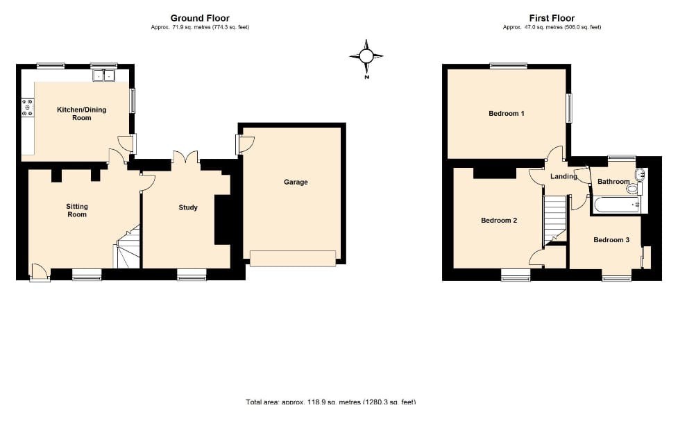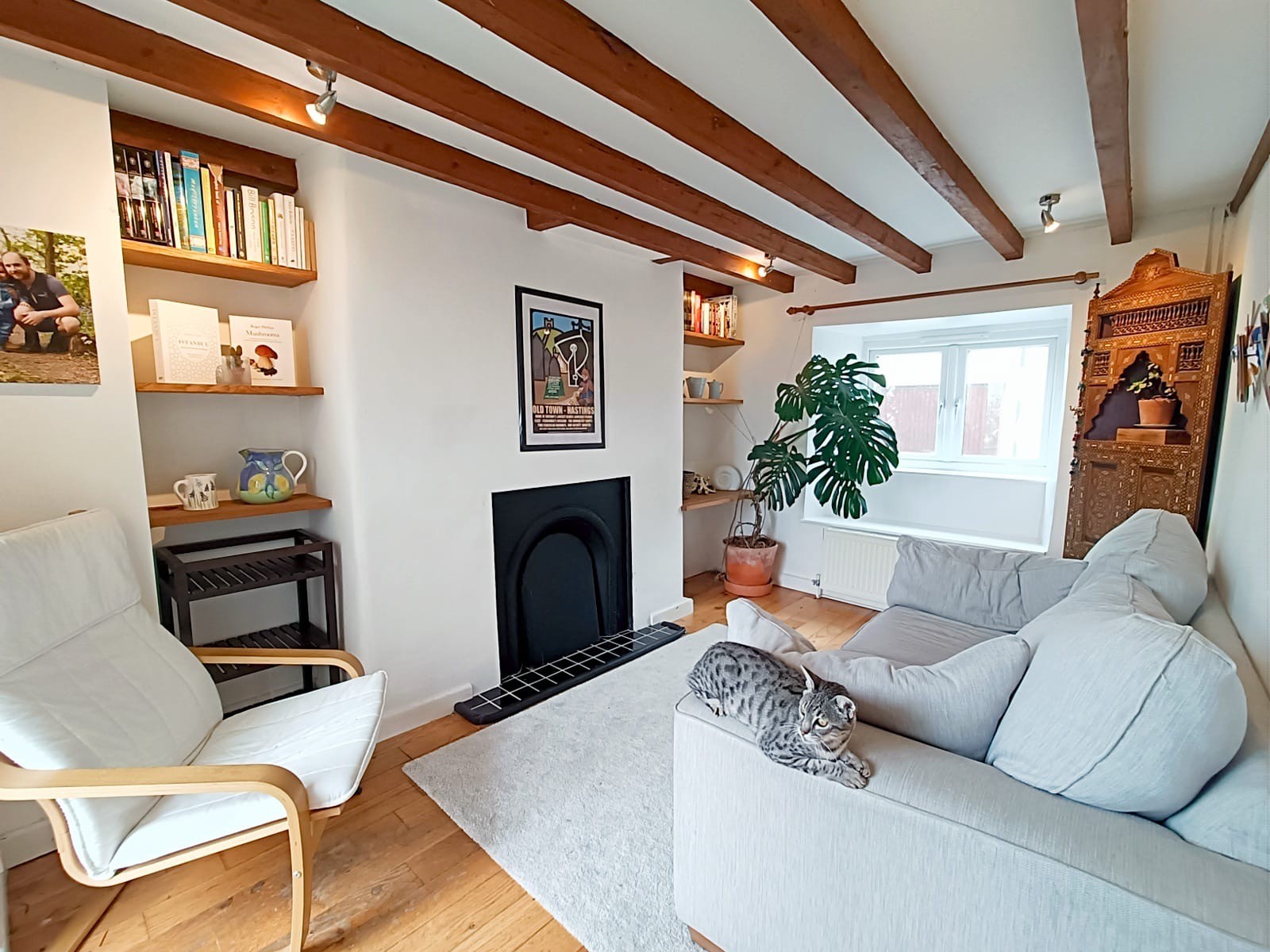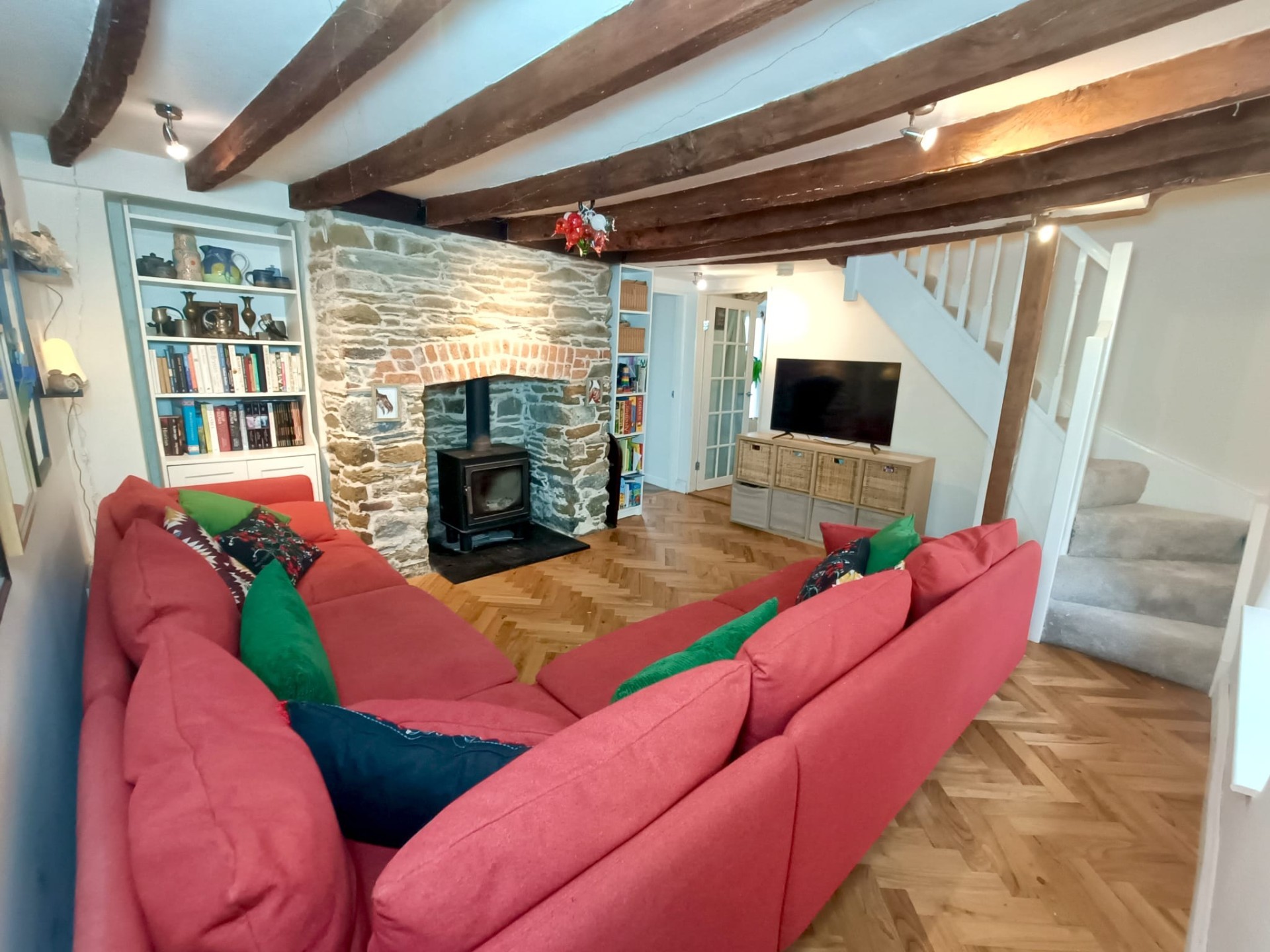 14' 1" x 14' 9" (4.3m x 4.5m) uPVC double glazed window to front elevation with window seat below. Exposed stone and brick fireplace with cast iron Wood-burner on slate hearth. Exposed wooden ceiling beams. Spotlights. Smoke Alarm. Solid Oak herringbone floor. Stairs leading to first floor with useful storage cupboard underneath. Telephone and TV points. Glazed panelled doors leading to the study and kitchen/dining room.